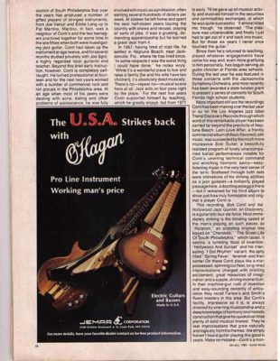 In 1966, having tired of road life, he settled in Neptune Beach, near Jacksonville, Fla., where he has lived since. “In some respects it was the worst thing I could have done,” he notes wryly. “While it’s a wonderful place to live and raise a family [he and his wife have two children], it’s absolutely dead musically. There’s no-repeat no-musical scene here at all. Jazz acts on tour pass right by the place.” For the next five years, Conti supported himself by teaching, which he enjoyed, but from 1971 to early ’76 he gave up all musical activity and involved himself in the securities and commodities exchanges, at which he was quite successful. “It almost killed me, though,” he observed. “The pressure was unbelievable, and finally I just had to return to music. But for those six years I never once touched the guitar.” Since then he’s returned to teaching, played whatever engagements have come his way. During the last year he was featured in three concerts with the Jacksonville Symphony Orchestra.
