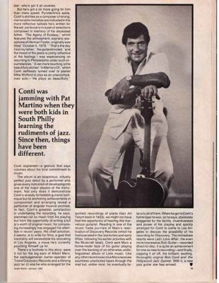 But he’s got a lot more going for him than mere speed. Pyrotechnics aside, Conti ‘s abilities as a composer of strong, memorable melodies are indicated in the more reflective ballads he’s written for the set, particularly in a pair of selections composed in memory of his deceased father. “The Agony of Ecstasy,” which features the atmospheric soprano saxophone of Herman Riley, originally was titled “October 5, 1979.” “That’s the day I lost my father,” the guitarist noted, “and the mood of the piece is very reflective of the feelings I was experiencing, on returning to Philadelphia under such circumstances.” Even more touching is the beautifully etched ”In Memory Of” which Conti selflessly turned over to pianist Mike Wofford to play as an unaccompanied solo - ”He plays so beautifully,” Conti explained - a gesture that says volumes about his total commitment to music.