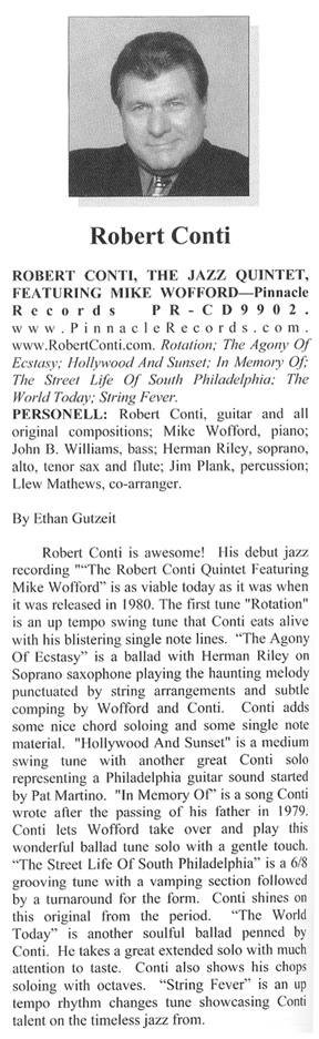 Robert Conti is awesome! His debut jazz recording "The Robert Conti Quintet Featuring Mike Wofford" is as viable today as it was when it was released in 1980. The first tune "Rotation" is an up tempo swing tune that Conti eats alive with his blistering single note lines. "The Agony Of Ecstasy" is a ballad with Herman Riley on Soprano saxophone playing the haunting melody punctuated by string arrangements and subtle comping by Wofford and Conti. Conti adds some nice chord soloing and some single note material. "Hollywood and Sunset" is a medium swing tune with another great Conti solo representing a Philadelphia guitar sound started by Pat Martino. "In Memory Of" is a song Conti wrote after the passing of his father in 1979. Conti lets Wofford take over and play this wonderful ballad tune solo with a gentle touch. "The Street Life Of South Philadelphia" is a 6/8 grooving tune with a vamping section followed by a turnaround for the form. Conti shines on this original from the period. "The World Today" is another soulful ballad penned by Conti. He takes a great extended solo with much attention to taste. Conti also shows his chops soloing with octaves. "String Fever" is an up tempo rhythm changes tune showcasing Conti talent on the timeless jazz form.