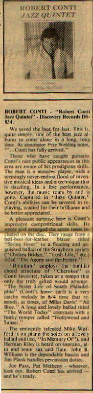 This recording, Robert Conti and The Jazz Quintet, on Discovery Records, is a guitaristic tour-de-force. Most immediately striking is the blinding speed of the man’s playing on such pieces as “Rotation,” an arresting original line based on “Cherokee;” “The Street Life Of South Philadelphia,” which boasts, it seems, a tumbling flood of invention; “Hollywood And Sunset” and his interesting “I Got Rhythm” variant, the aptly titled “String Fever,” feverish and then some! On these, Conti plays like a man possessed, spinning out fleet, long-lined improvisations charged with bristling excitement, great resources of imagination and a supple, driving momentum. In their machine-gun rush of invention and easy-sounding dexterity of articulation they recall Farlow’s and Smith’s fluent mastery in this area. But Conti’s facility, impressive as it is, is always directed by unerring musicianship and a deep knowledge of harmony and melodic construction that give his quicksilver lines plenty of solid musical interest. They’re real improvisations that grow naturally and logically from his themes. We simply haven’t heard guitar playing this good in years. Make no mistake-Conti’s a monster, who’s got it all covered.